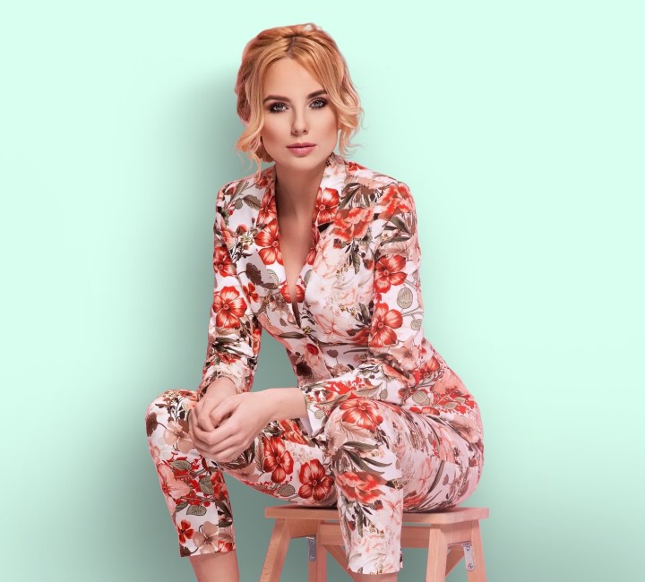 Kadın uzun kollu v yakalı desenli viskon iki iplik bluz ve pantolon ikili takım